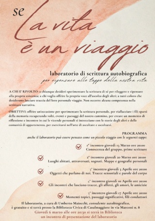 La Biblioteca Civica di Casalmaggiore ospiterà, giovedì 6 marzo alle ore 20:30, un incontro di presentazione tenuto da Umberto Maiocchi del laboratorio di scrittura autobiografica "Se la vita è un viaggio".