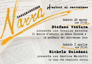 Si aprirà sabato 25 marzo alle 17:00 con Stefano Ventura che dialogherà con Ornella Anversa per presentare il suo ultimo libro Il monile d'avorio: la donna faraone e la profezia del dodicesimo Inca, che vede protagonisti due giovani archeologi in un romanzo avvincente e avventuroso, che fa viaggiare nel tempo e nello spazio, da Tebe a Cuzco, capitale dell'impero inca, fino ad arrivare in Cile.